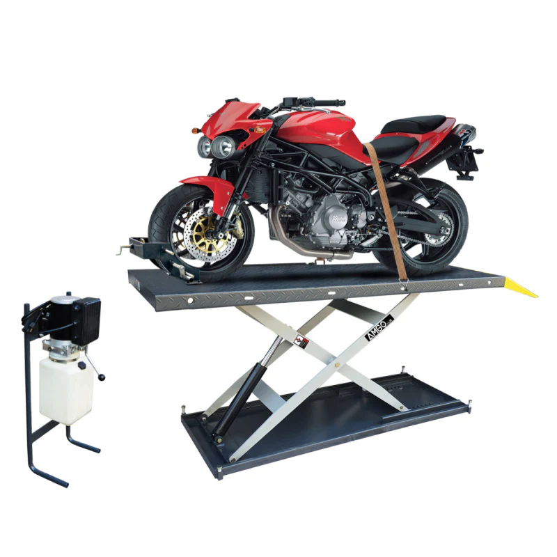 The AMGO MC-1200 Motorcycle Lift is a professional-grade service lift designed to deliver safe, fast, and efficient motorcycle maintenance. With a 1,200 lb lifting capacity, it features an adjustable wheel vise that securely accommodates a wide range of motorcycle sizes.